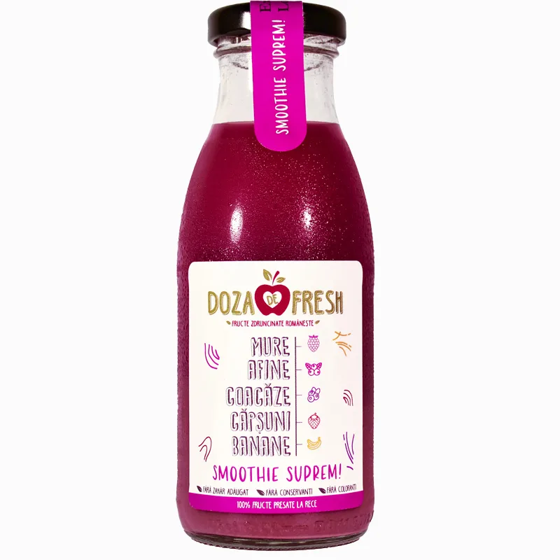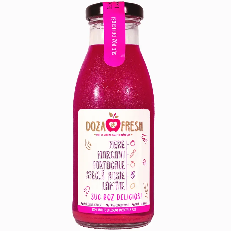 Sucuri si Smoothie-uri Naturale din 100% Fructe și Legume Presate la Rece! Produse in fabrica de sucuri naturale Doza de Fresh, imbuteliate la sticla. Fără adaos de zahăr, fără concentrat, fără coloranți, fără aditivi!